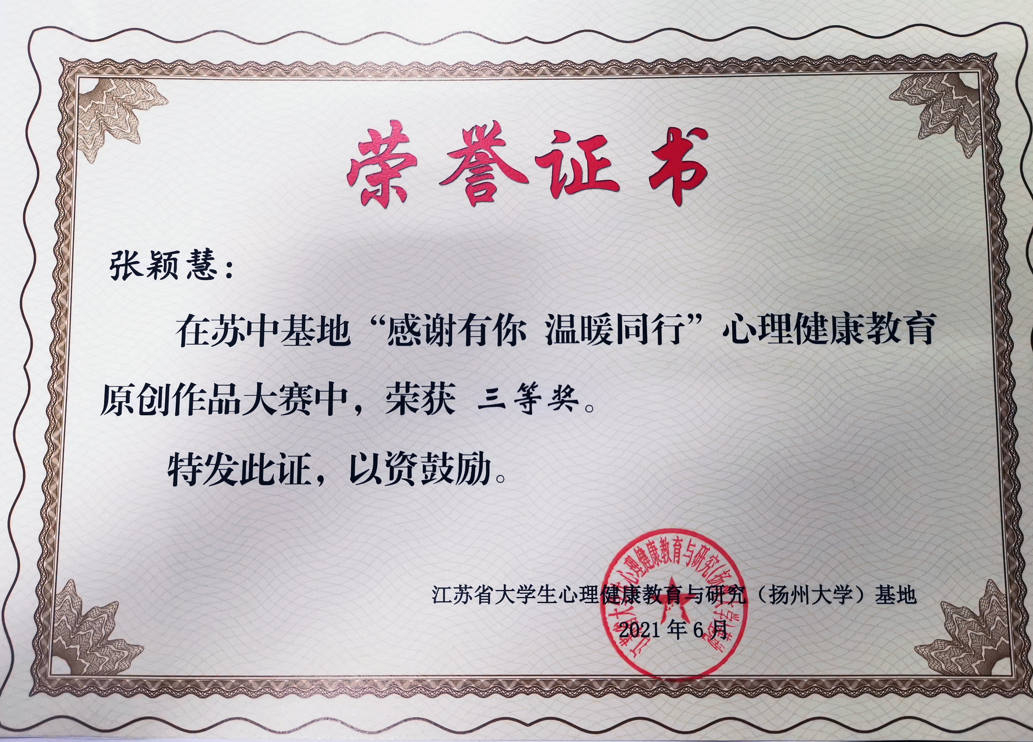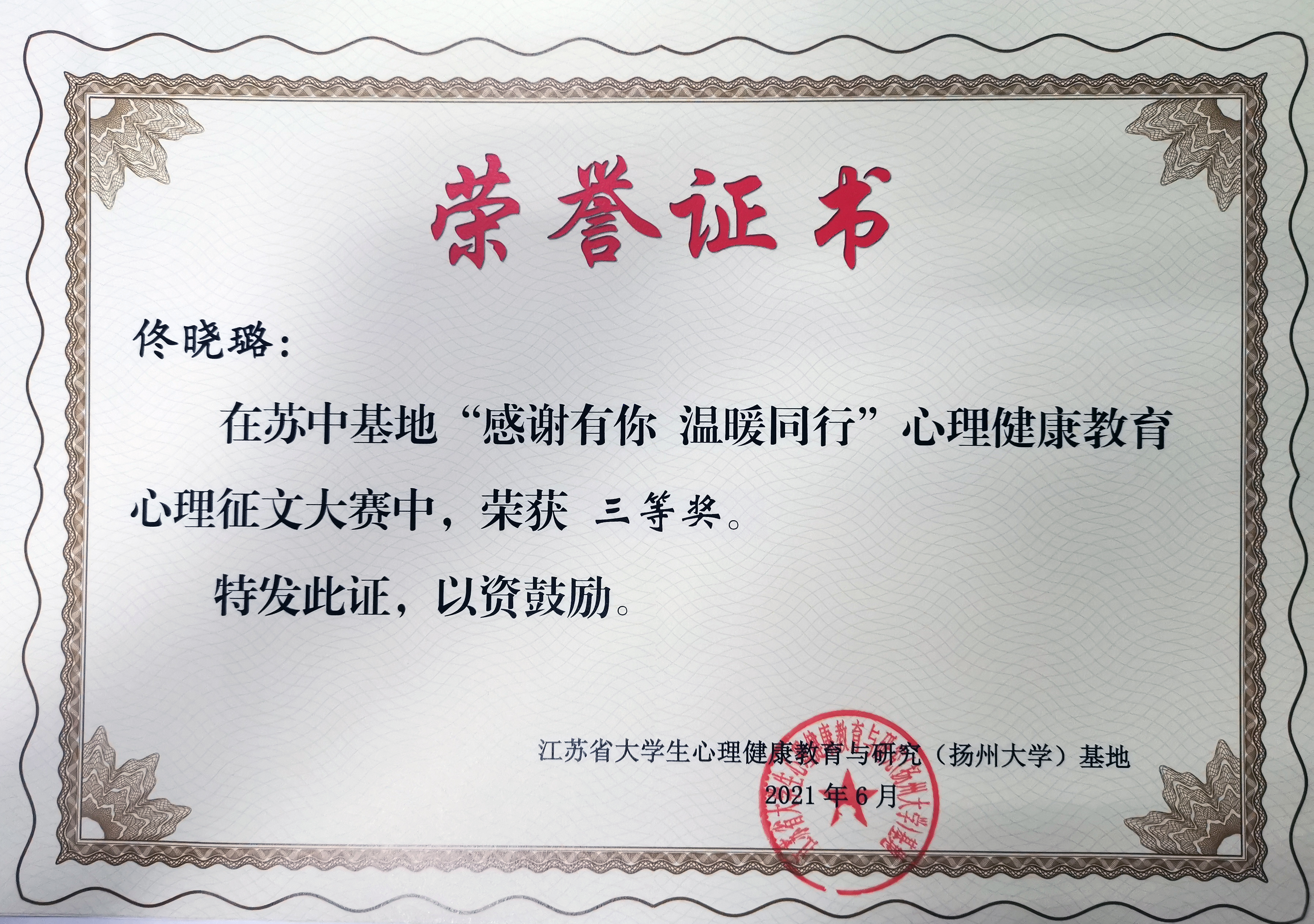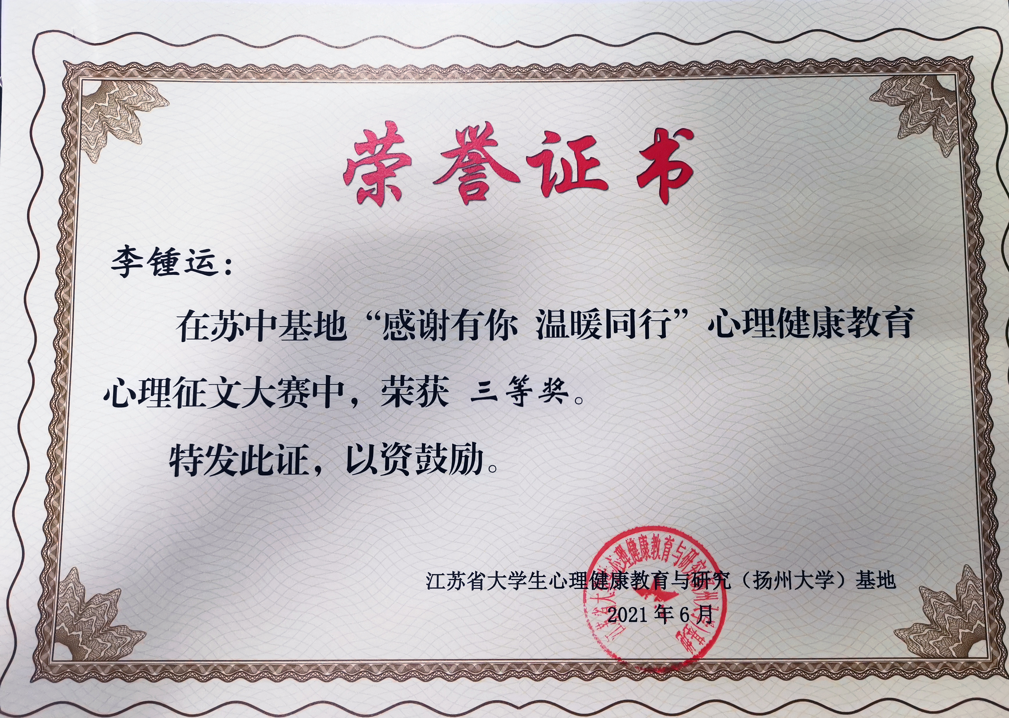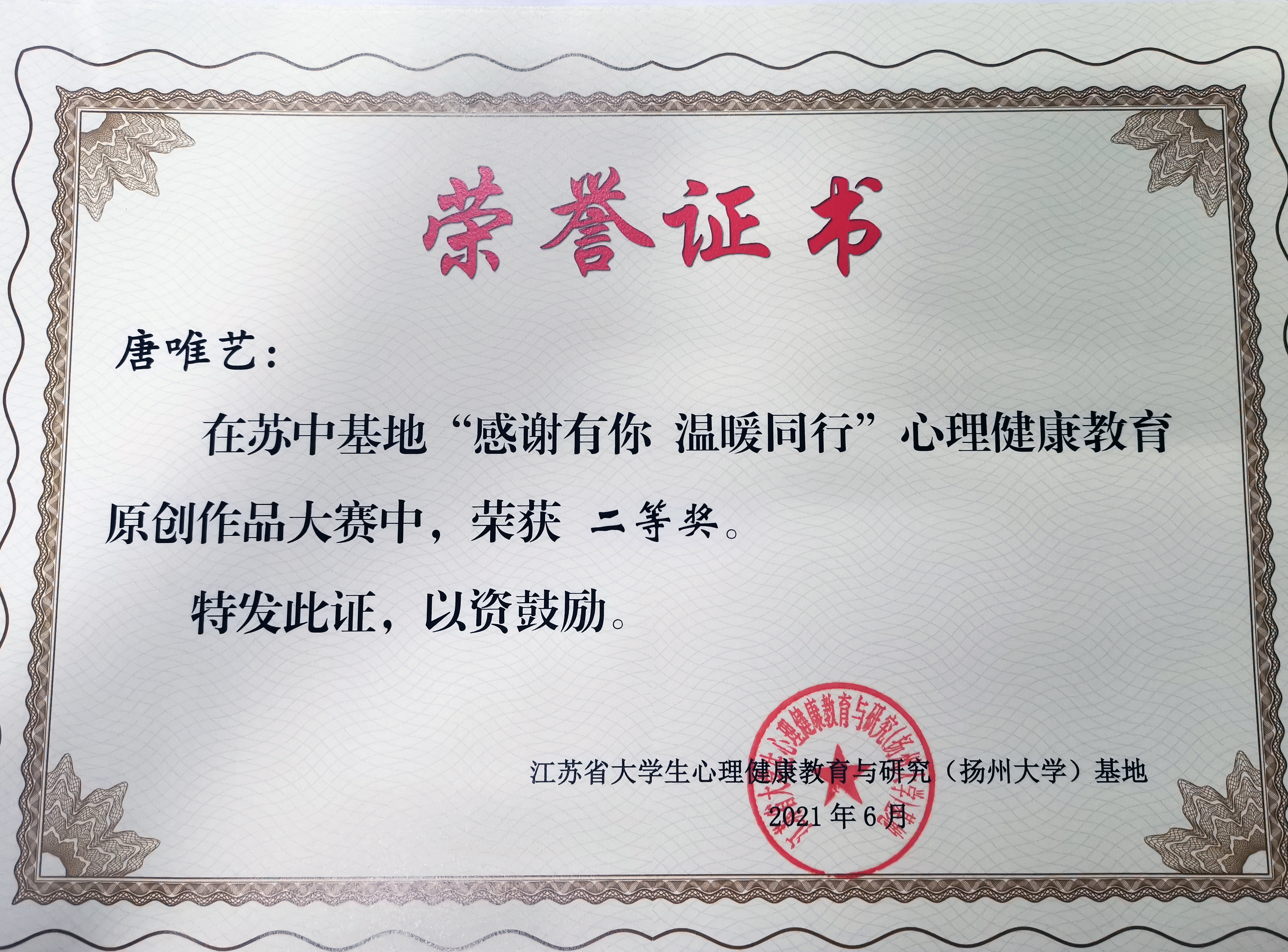 近日,江苏省大学生心理健康教育与研究(扬州大学)基地举办了“感谢有你,温暖同行”心理健康教育原创作品大赛。经评选,我院机制204唐唯艺同学荣获二等奖,视觉202李锺运、财务194张颖慧、国贸181佟晓璐同学获得三等奖。
