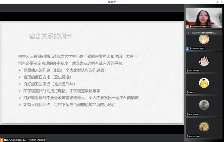 为强化我院宿舍长职责能力,凝聚集体力量,促进宿舍和谐氛围,加强其助人和预警的能力建设,充分发挥朋辈心理的互助作用和桥梁纽带作用,4月9日下午,院心理健康教育中心通过线上腾讯会议开展心理健康教育讲座之宿舍长职能培训。培训由院心理健康教育中心王芯蕊主讲,学院全体宿舍长参加。