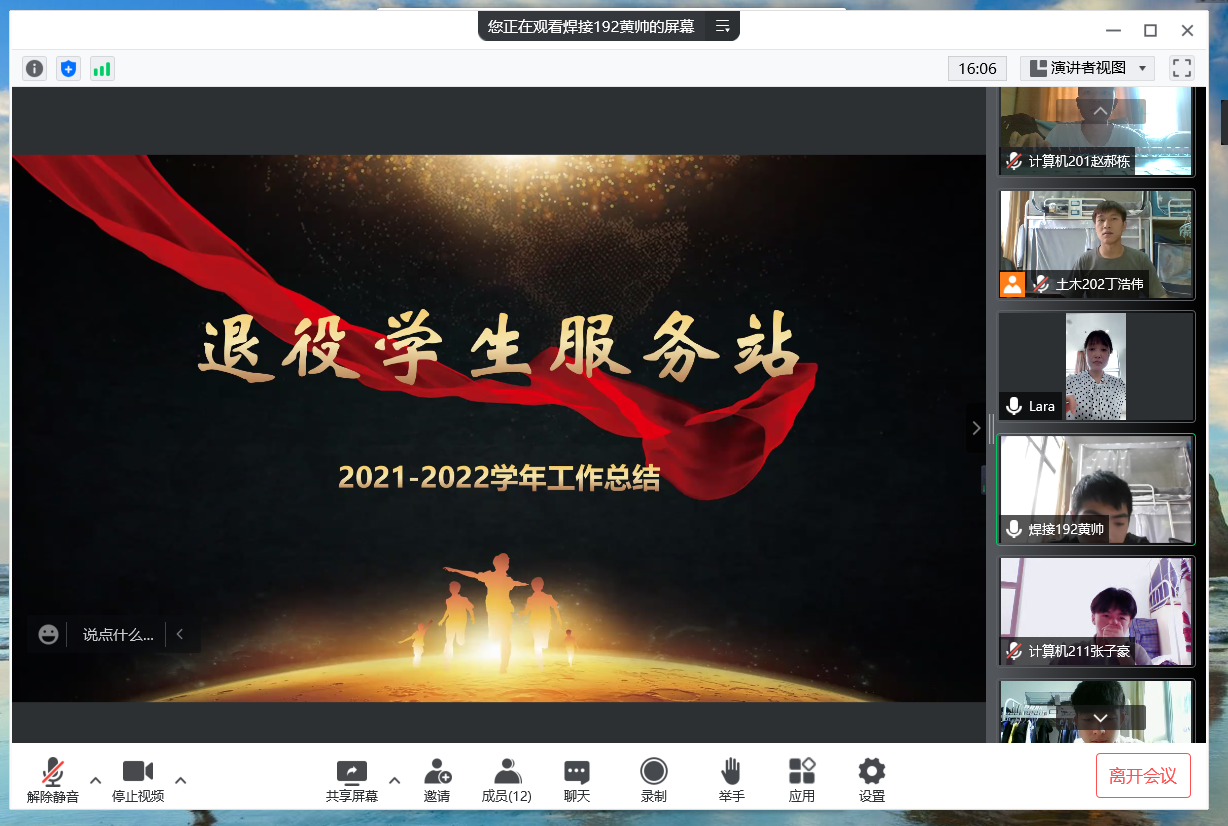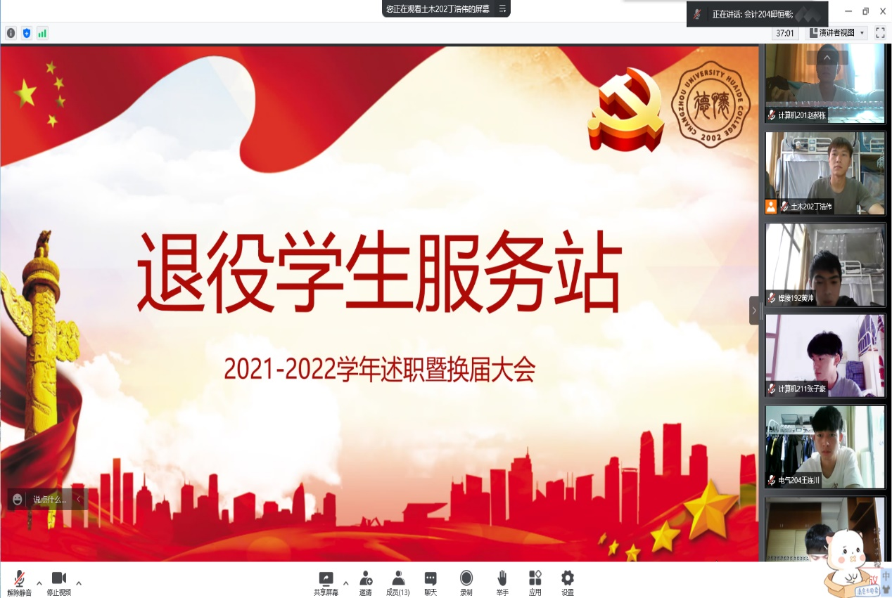 为营造良好的工作氛围,进一步促进站内各项工作开展,5月31日,退役学生服务站于线上召开述职换届大会。指导老师刘婧娴、全体站内成员参会。