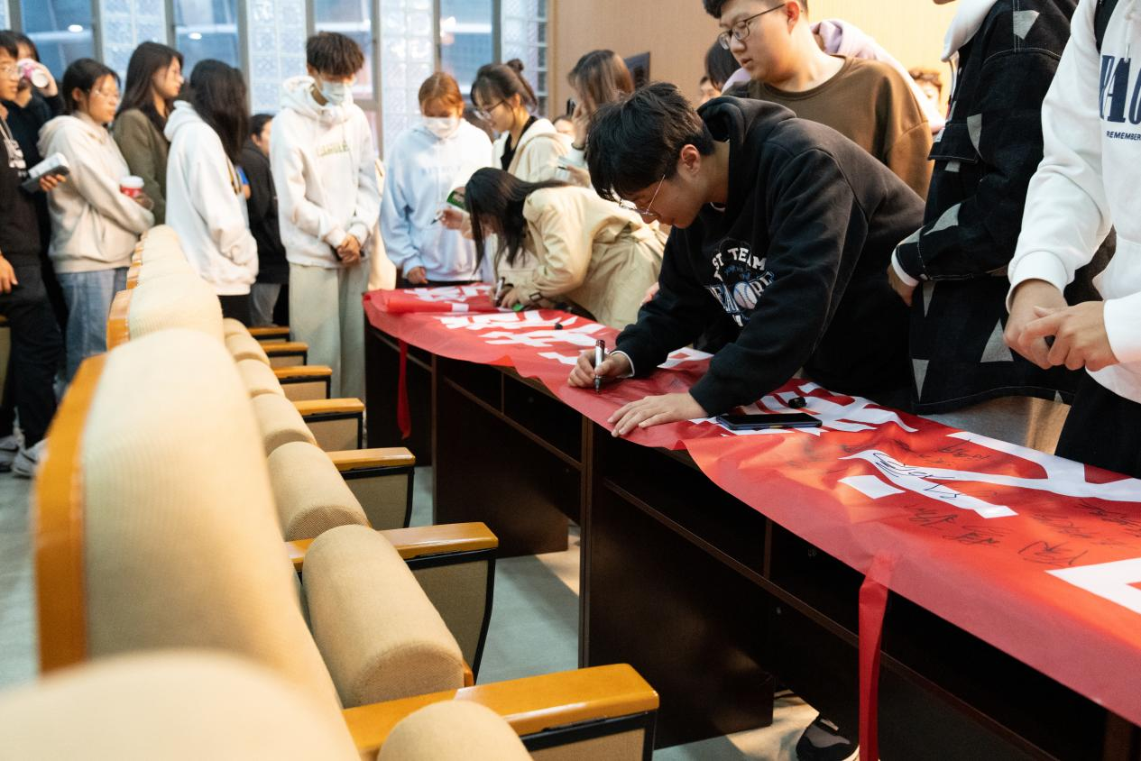 会议伊始,由张明军作学风建设月整体工作安排同时表达了对同学们树立优良学风意识的殷切期盼,接着国奖优秀学生代表杨洪发言,与同学们分享了自己的学习经验,并鼓励同学们从自身做起、自觉自律,随后,院自律中心学生代表杨玲宣读学风建设月倡议书,激励同学们要真正承担起严肃学风的重任,为我院建设优良学风贡献自己的力量。最后,刘国仕就学风建设月向全体参会人员提出“六抓六促”工作意见:一要抓目标,促重点,通过典型事例,发挥榜样作用;二要抓规范,促行为,深入开展校纪校规学习活动;三要抓课堂,促学习,做好自习和课堂考勤制度;四要抓班风,促学风,开展班级为单位的学风活动;五要抓考风,促纪律,开展考纪考风教育,营造良好的考试氛围;六要抓活动,促信心,开展积极向上利于个人风采展示的活动,促进同学间学习互助氛围的形成。会后出席人员有序地在工作人员地安排下于学风建设月活动横幅上签名。