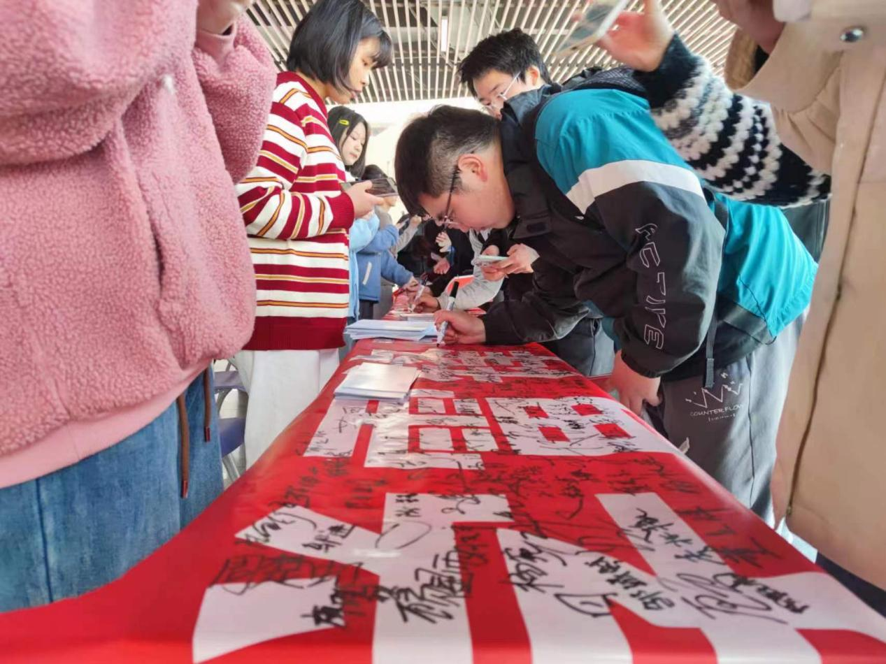 活动现场氛围热烈,学生们纷纷在横幅上签下自己的名字,以此传承和学习雷锋精神。同时,一旁的工作人员围绕“奖、助、贷、勤、减、补”学生资助体系,讲解国家相关资助政策,为同学们解答资助问题。