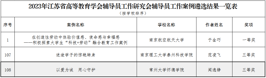 近日,江苏省高等教育学会辅导员工作研究委员会公布了2023年辅导员工作案例遴选结果,我院经济管理系辅导员闻逸铮撰写的《以爱为诚 用心守护》获工作案例评比三等奖。