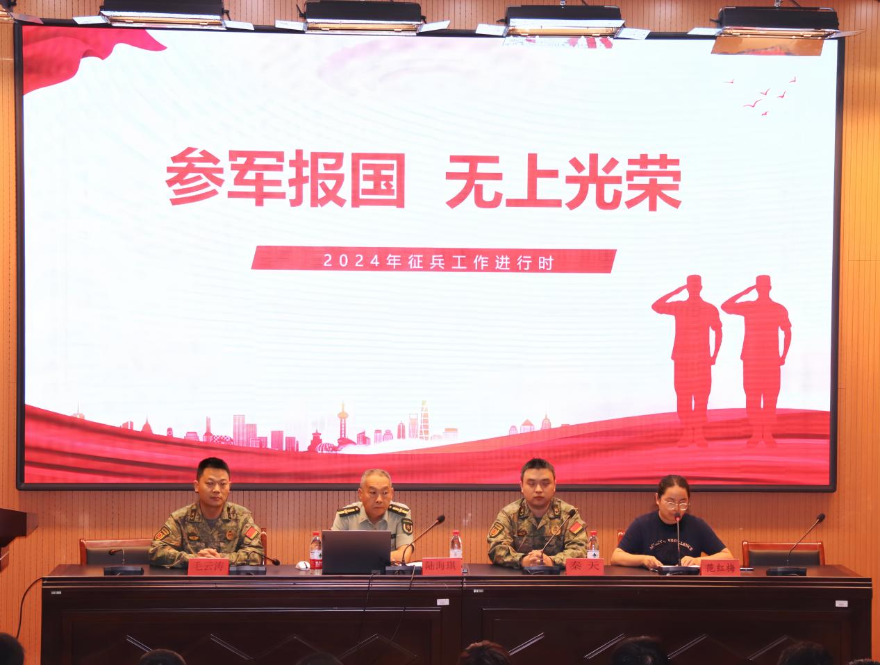 为积极响应“参军入伍,报效祖国”的号召,落实好全省大学生征兵工作要求,使广大学生了解征兵相关政策,进一步激发适龄青年的应征热情,6月5日,靖江市人武部军事科参谋陆海琪、斜桥镇人武部部长秦天一行来我院开展2024年秋季征兵宣讲会。