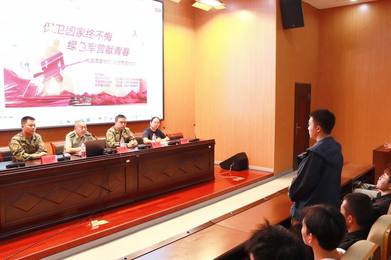 会上,刘海琪一行介绍了怀德学院近年来的征兵情况,向同学们宣传了兵役法和征兵工作条例,号召广大青年学生踊跃报名参军,并特别对应征入伍程序、注意事项及征兵工作时间、对象、年龄、学历要求等内容进行了详细讲解,帮助学生更直观、全面地了解征兵各项政策内容。宣讲会重点宣传了应届生入伍的优势,并与参会学生进行互动答疑,为我院毕业生高质量就业提供了重要思路。