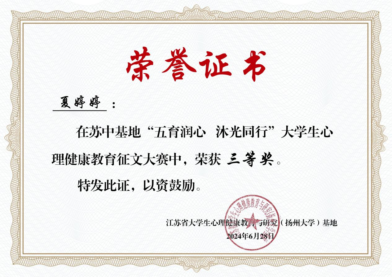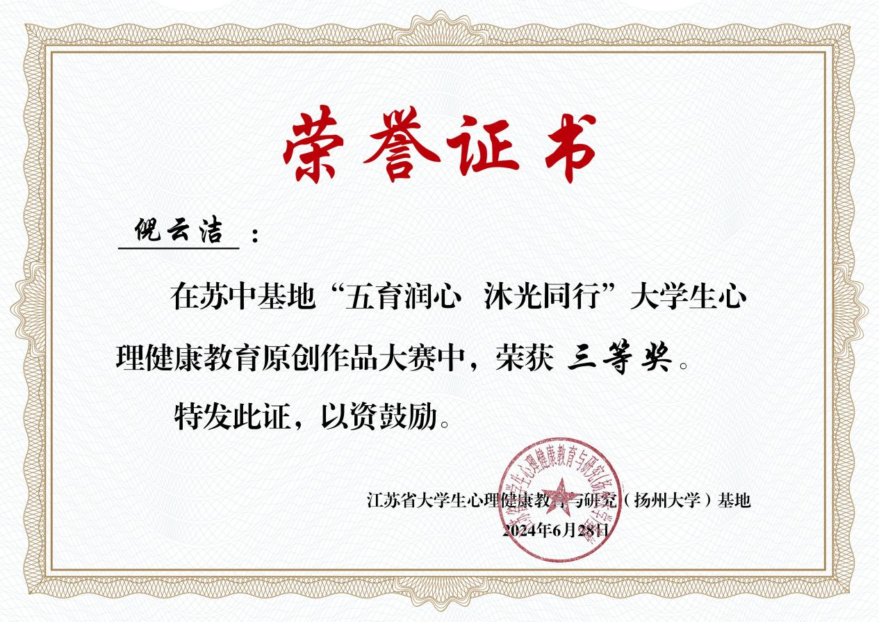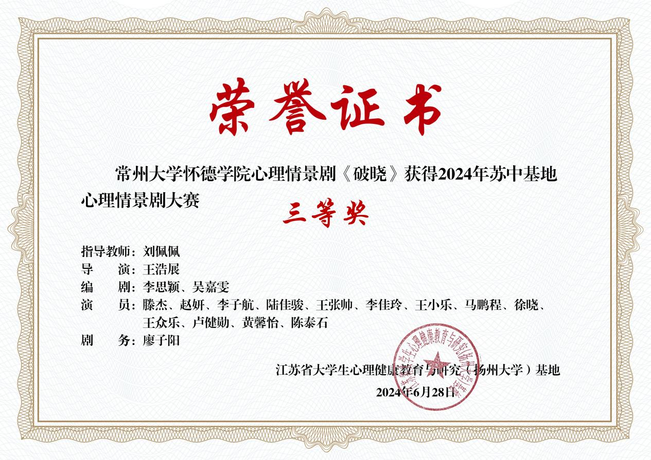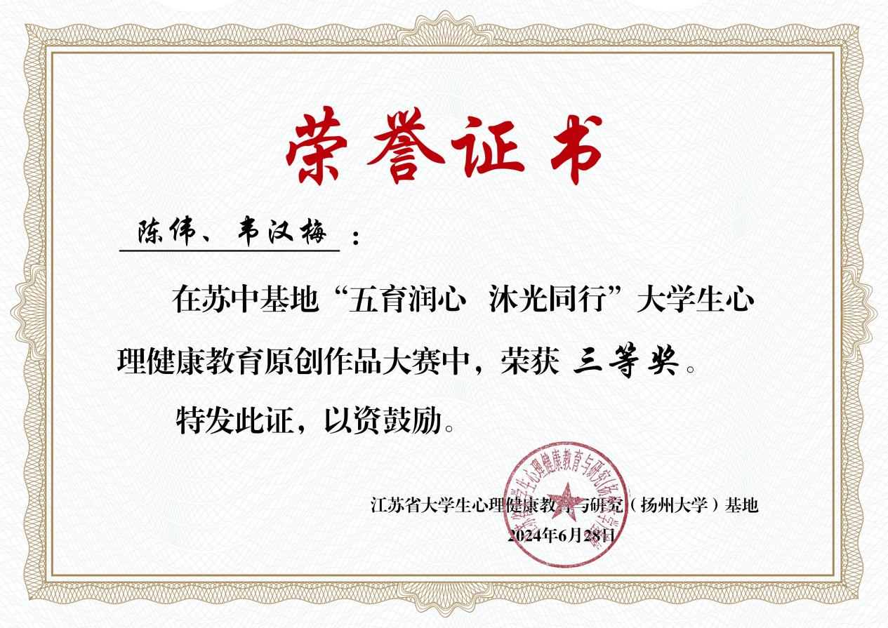 近日,经苏中基地评比,陈泰石、夏婷婷在征文大赛中分获二、三等奖,倪云洁、陈伟&韦汉梅在原创作品大赛中获得三等奖,由刘佩佩老师指导的心理情景剧《破晓》获得三等奖。