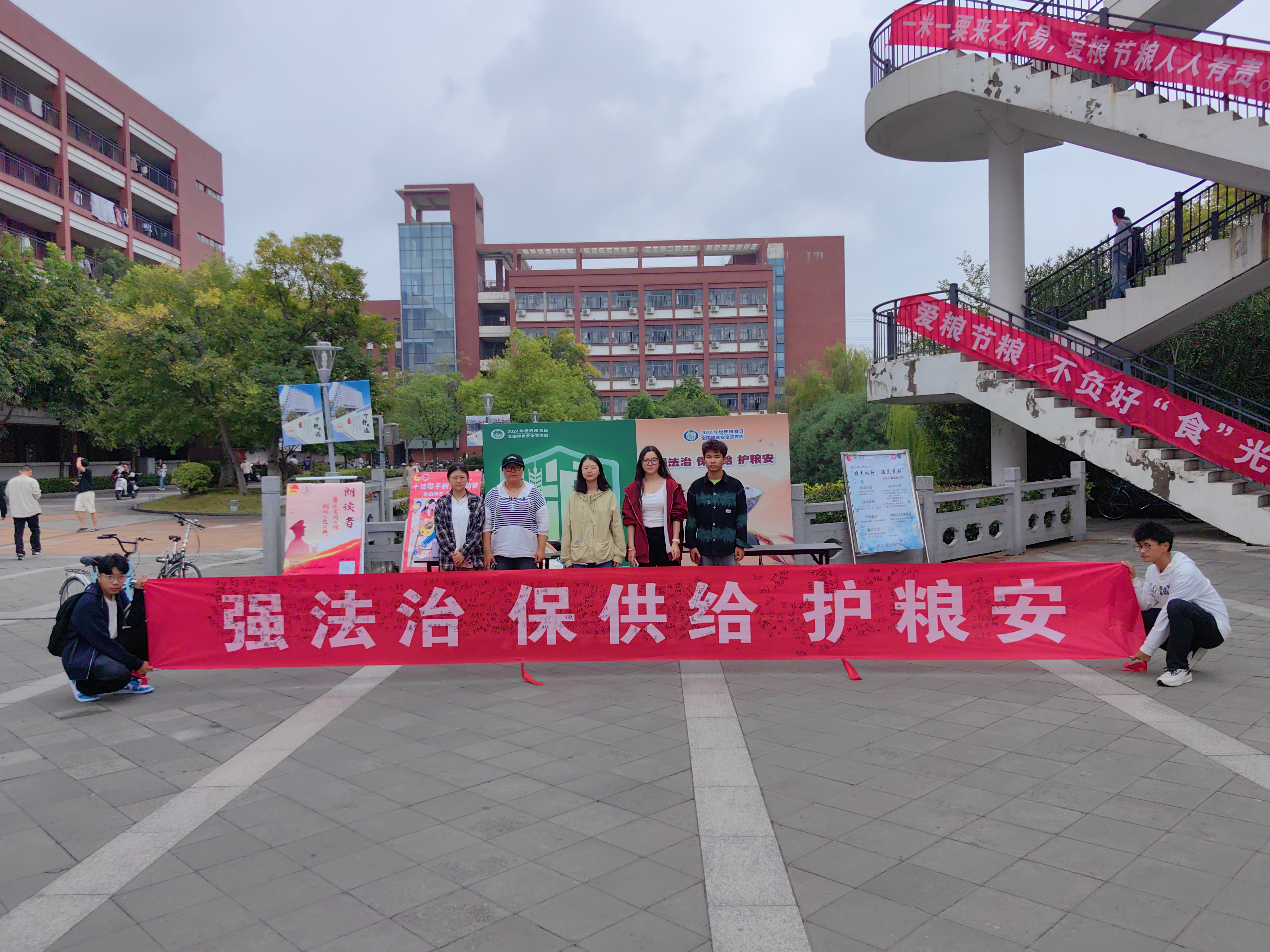 活动紧紧围绕本次世界粮食日的主题“粮安天下,共建更好生活,共创美好未来”来展开。在活动现场,采取张贴节粮海报、悬挂宣传横幅、发放宣传册等方式向同学们宣传爱粮护粮知识,气氛热烈,参与人员络绎不绝。同学们纷纷在印有“强法治、保供给、护粮安“的横幅上签名并承诺“从自身做起,传承中华节俭美德,践行’光盘行动’”以表达对此次活动的赞同和支持。在现场工作人员及参与人员的共同努力下,本次活动圆满结束。