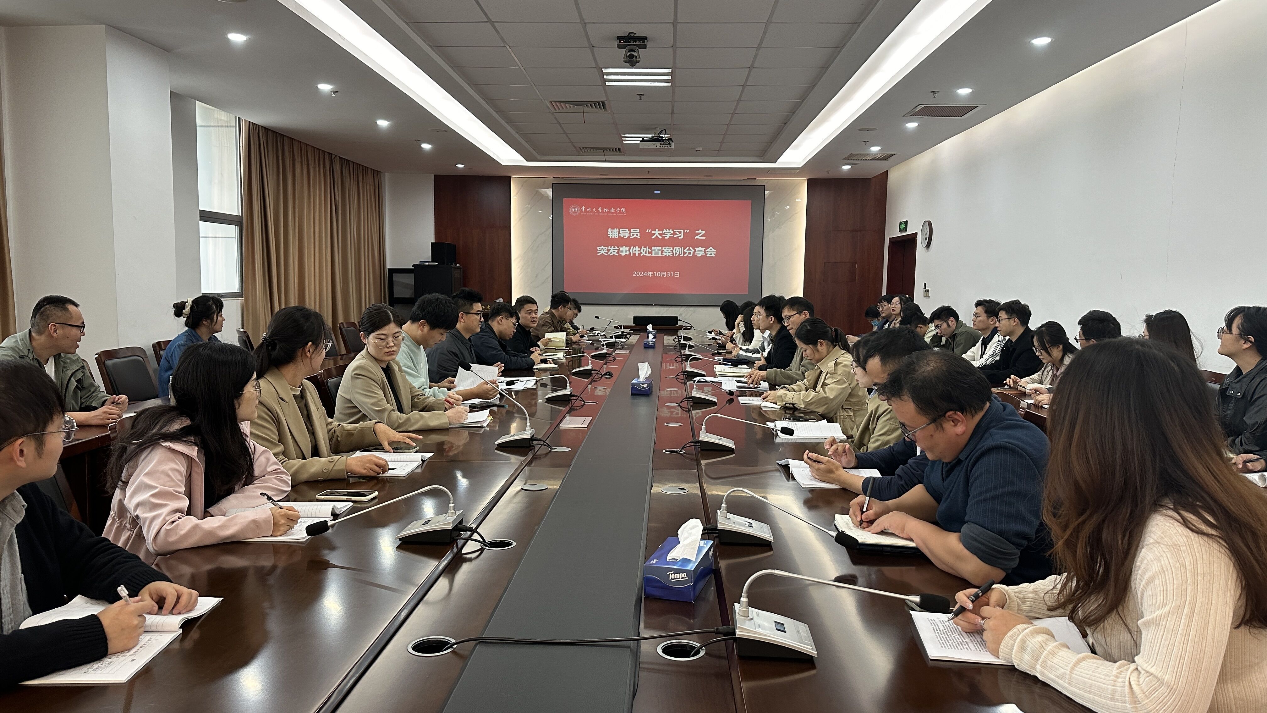 为强化我院辅导员突发事件处置能力,提升我院辅导员队伍职业能力。10月31日下午,我院在第二会议室召开辅导员大学习之突发事件处置案例分享会。本次分享会由学生工作处处长张明军主持,各系党总支副书记、学生工作处相关成员及全体辅导员参加会议。