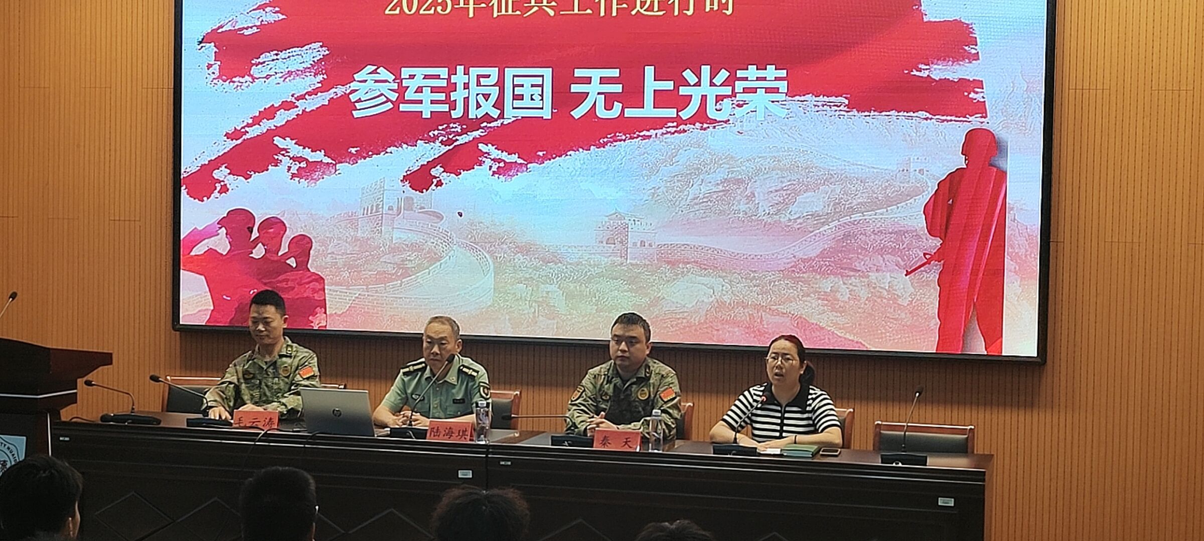 为扎实推进大学生征兵工作,6月5日,学院人武部组织召开2025年秋季征兵宣讲会,靖江市人武部参谋陆海琪、斜桥镇人武部部长秦天、副部长毛云涛出席活动,院人武部副部长范红梅主持会议。