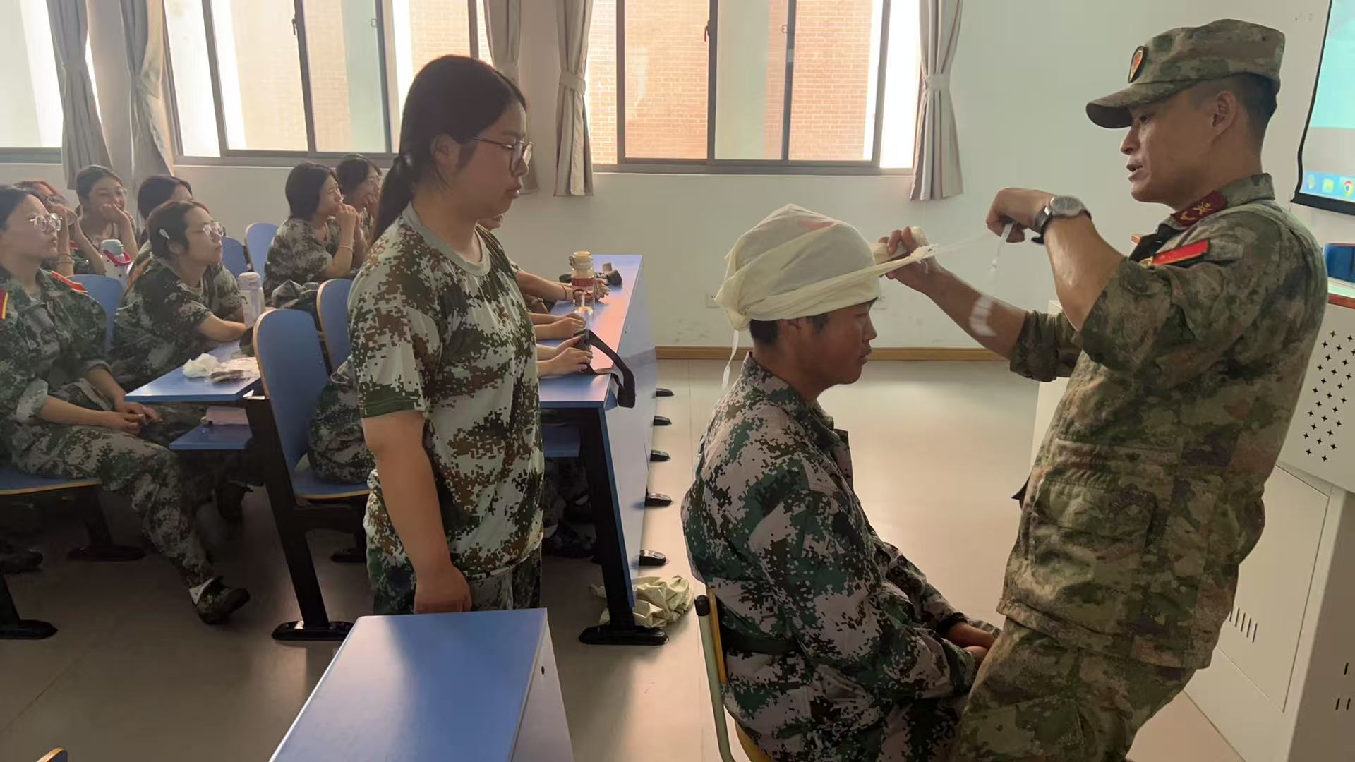 为普及应急救护知识,提升学生在突发事件中的自救互救能力,9月25日,院人武部组织2025级全体新生开展战场医疗救护培训,靖江市人武部军训教官受邀指导。