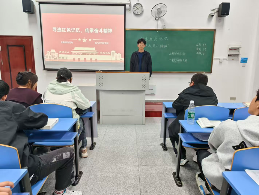 活动以“寻迹红色记忆,传承奋斗精神”为核心,通过理论宣讲与实践互动相结合的形式展开。团支书刘诗泽首先向同学们讲解了“寻迹红色记忆,传承奋斗精神”的重要性及深远意义,带领大家回顾了革命先辈在艰难岁月中坚守信仰、勇毅前行的感人事迹。接着,刘诗泽通过精心制作的PPT宣讲与励志视频播放,生动展现了先辈们的奋斗历程与精神风貌。最后,刘诗泽号召大家将红色精神融入日常学习与生活,以实际行动传承奋斗精神,为实现中华民族伟大复兴贡献青春力量。