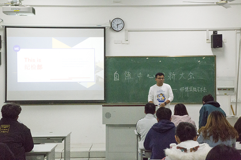 在此次会议中,金超老师为同学们解说自律的意义和对于入党的重要性,希望同学们可以积极参与校园活动,培养自律意识。对同学们寄予厚望,希望大家从我做起带动校园良好的学习自律氛围,然后自律中心各个部门的部长上台介绍本部门的各项职能,最后同学们都依据介绍进入了理想部门。