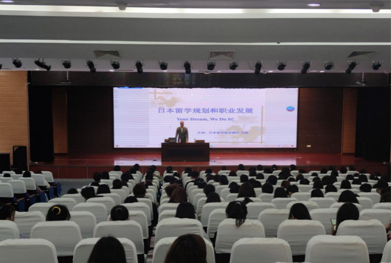 10月19日下午14时,外语系和艺术系在怀德楼报告厅联合举办日本留学规划和关于毕业职业发展方面的讲座。此次的讲座由日本留学指导顾问邱威演讲,外语系和艺术系的全体教职工及学生参加。