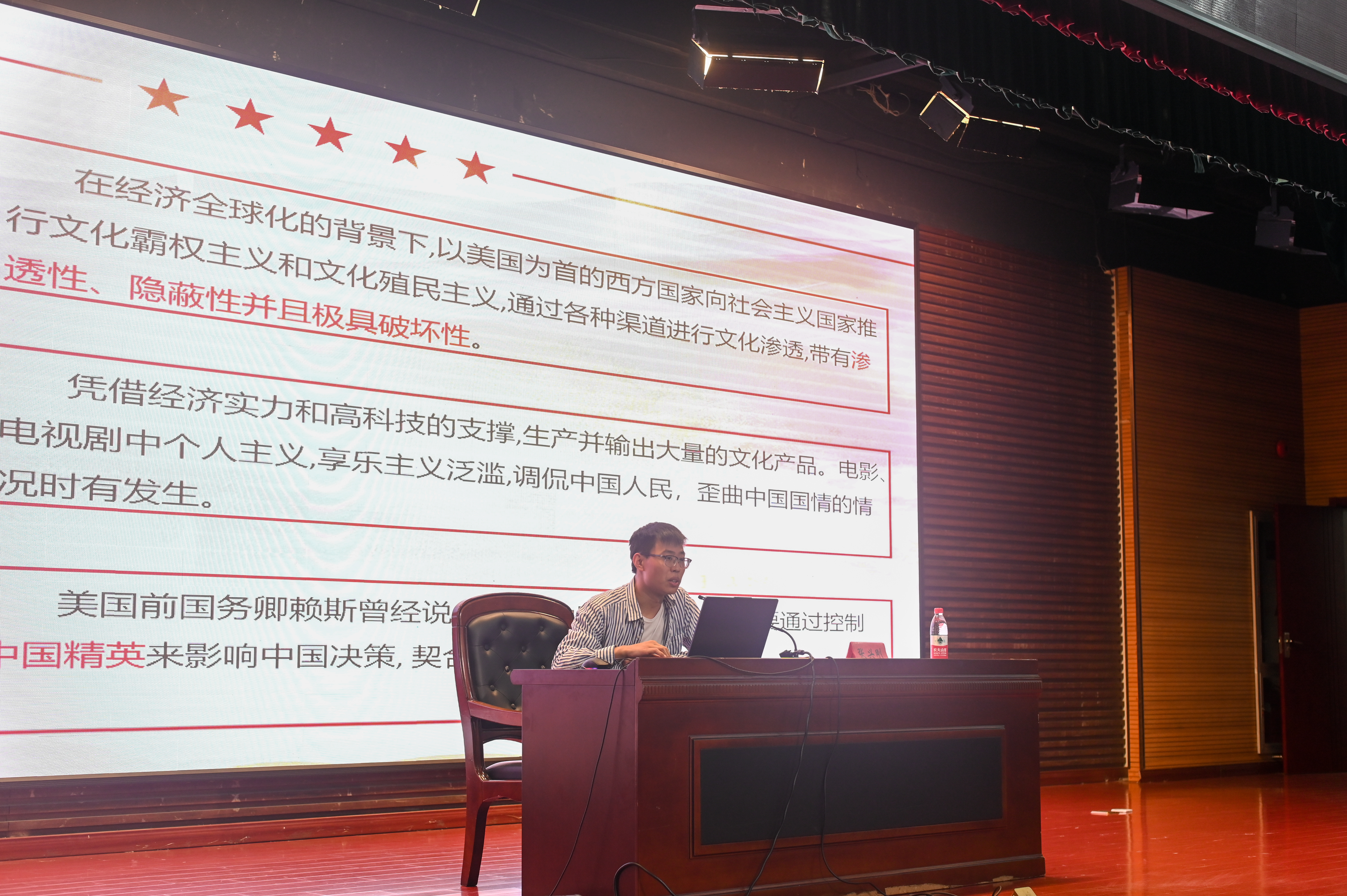 为高举习近平新时代中国特色社会主义思想伟大旗帜,深入学习宣传贯彻习近平总书记在纪念五四运动100周年大会上的重要讲话精神。艺术系于5月27日在怀德楼报告厅开展了本学期第五讲——暗流涌动。本次会议由张兴刚老师主讲,青马成员及各班学生干部均全部参加。