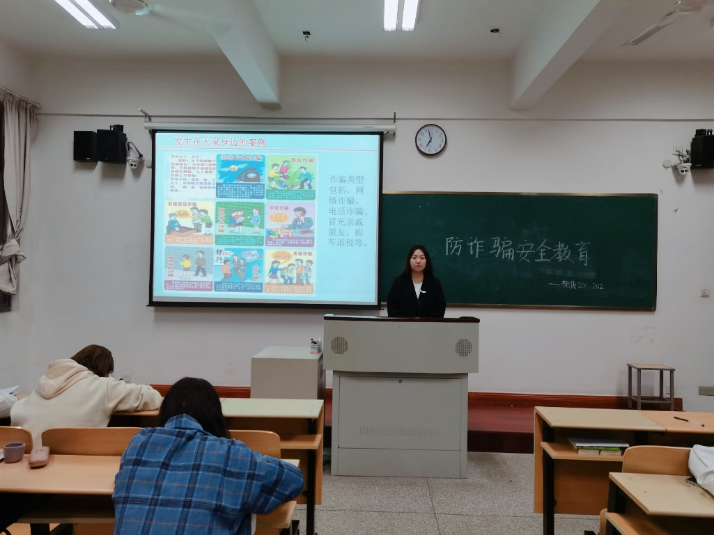 会上,团支书首先向同学们播放防诈骗的宣传片,向同学们展示了现今社会上常见的诈骗形式和诈骗手段,提高了同学们对防诈骗的关注度。视频观看结束后,学生代表就讲座现场所提及的真实诈骗案例进行了分析,并多次强调要提高防范意识,加强警惕性。