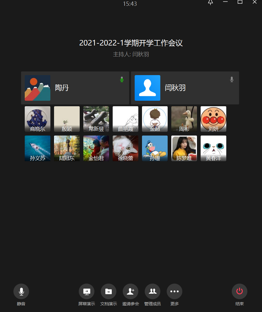 为保障我系各项工作顺利开展,圆满完成新学期各项工作。9月16日中午,我系通过企业微信召开2021-2022-1开学教学线上党政联席工作会议,部署新学期主要工作。会议由系主任闫秋羽主持,系全体教职员工参加。