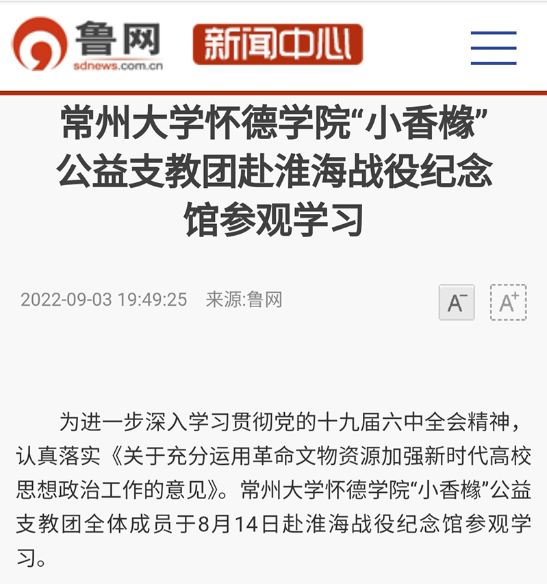 为进一步深入学习贯彻党的十九届六中全会精神,认真落实《关于充分运用革命文物资源加强新时代高校思想政治工作的意见》。常州大学怀德学院“小香橼”公益支教团全体成员于8月14日赴淮海战役纪念馆参观学习。