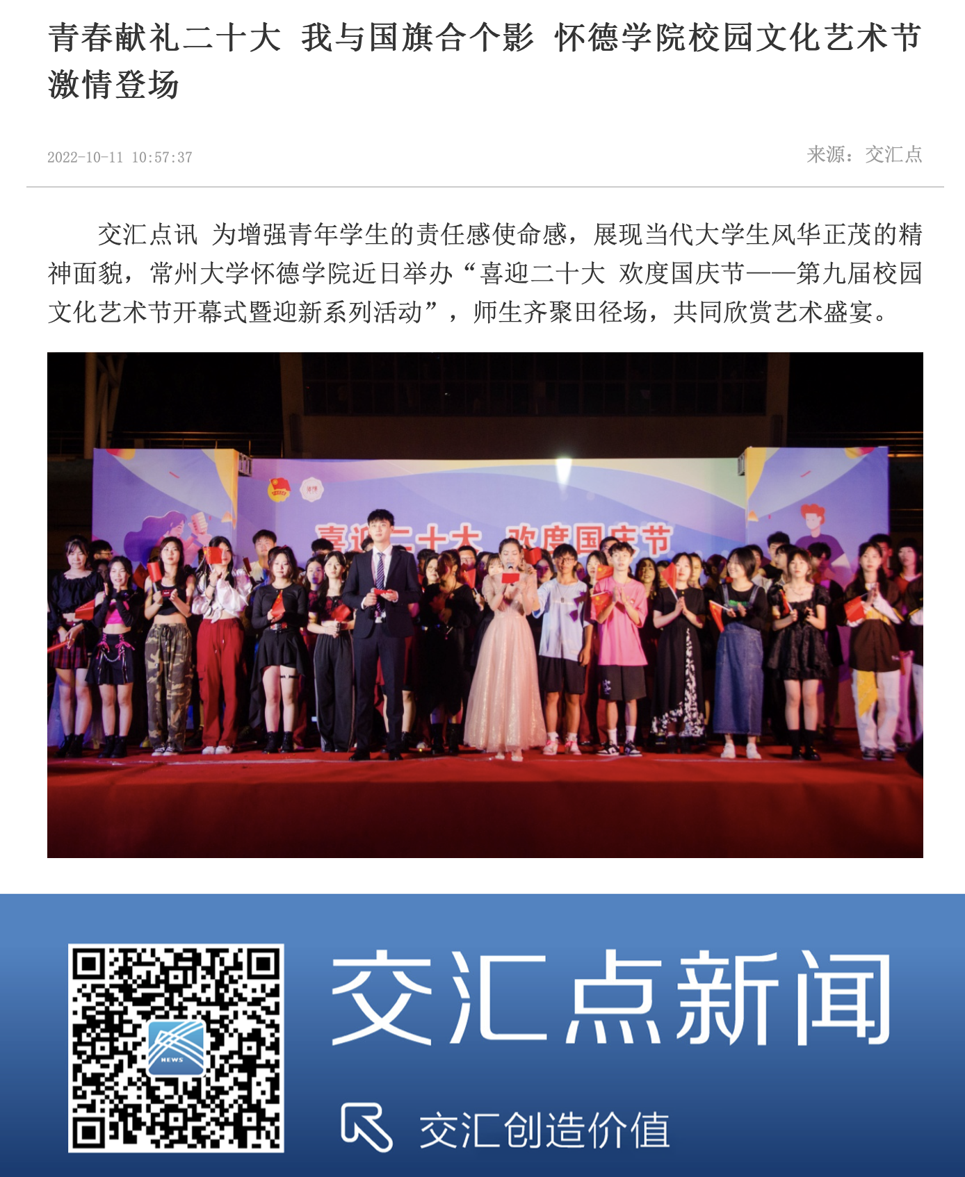 交汇点讯 为增强青年学生的责任感使命感,展现当代大学生风华正茂的精神面貌,常州大学怀德学院近日举办“喜迎二十大 欢度国庆节——第九届校园文化艺术节开幕式暨迎新系列活动”,师生齐聚田径场,共同欣赏艺术盛宴。