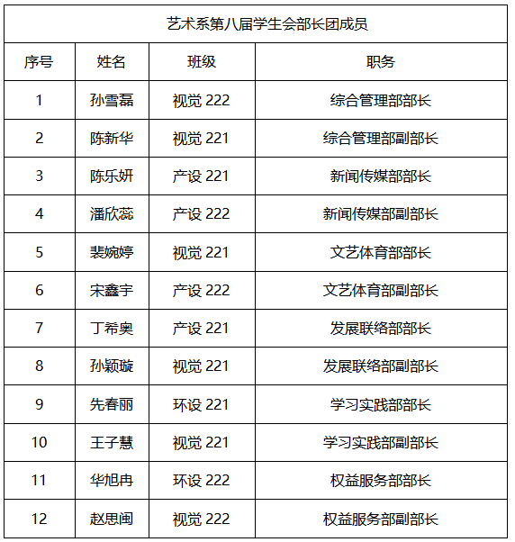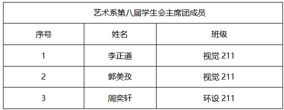 根据《关于推动高校学生会(研究生会)深化改革的若干意见》文件精神和《关于开展常州大学怀德学院艺术系团总支学生组织换届选聘的通知》要求,经自主报名、面试选拔,拟确定李正道、郭美孜,周奕轩 3 位同学为艺术系第八届学生会主席团成员,孙雪磊,陈新华等12人为部长团成员,现予以公示: