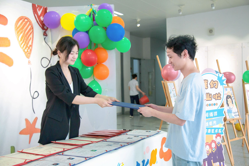 活动伊始,在毕业生辅导员金超、艺术系党总支副书记司马亚琴的带领下,学生会成员将毕业证学位证整理分类,根据不同班级分设毕业证学位证发放点。毕业生们根据指示牌来到活动现场,首先在笑脸墙上绘制专属笑脸;接着在毕业证学位证发放点有序地填写信息,学生会成员认真严谨地核对信息后为毕业生发放毕业证学位证,最后在摄影师的指导下毕业生们在打卡墙前拍照留念。