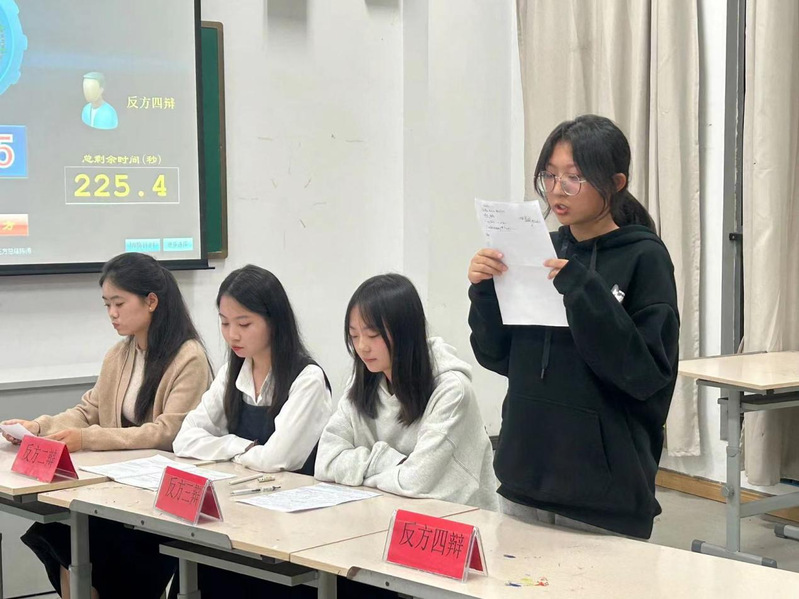 本次比赛分为两场,第一场:辩手们针对“爸爸每周陪伴孩子时间少于12个小时取消爸爸的称号,是支持还是反对“展开辩论。第二场:辩手们针对”面对突如其来的灾难,英雄的背影/彼此的歌声更能鼓舞我们。“辩论开始前由主持人分别介绍评委以及比赛环节。辩论开始后,辩手们通过四个环节进行辩论,分别是:开篇辩论,对辩环节,自由辩论,总结陈词。辩论过程中,辩手们妙语连珠,台下观赛同学凝神聆听,掌声不断,共同推动着比赛顺利进行。
