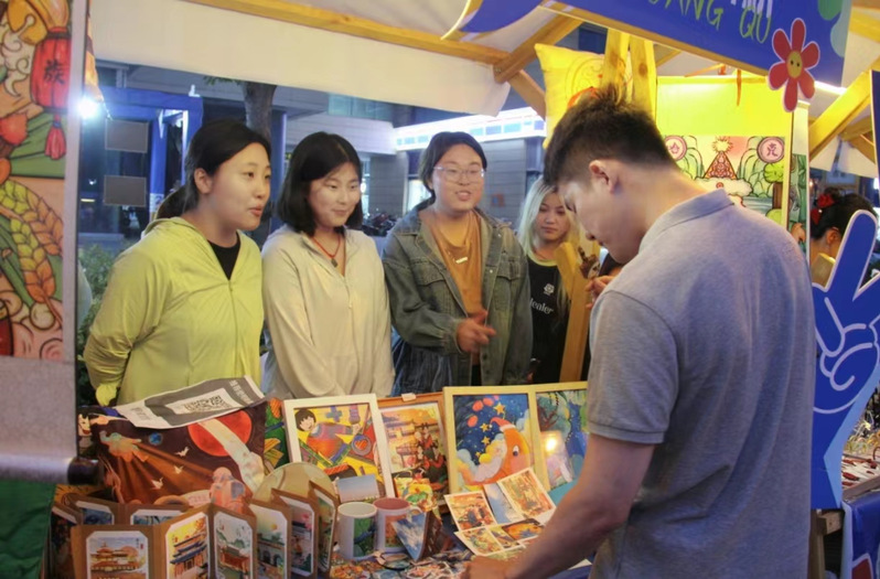 活动开始前由负责人向参与活动的学生讲述本次活动的主要目的和注意事项,进一步明确本次文旅活动的意义。随后带领学生来到活动场地并分配提供的摊位,便于后续积极准备、挥洒创意才能。活动期间,我系摊位上的销售商品均来源于我系大四学生的毕业原创设计,摊位上有抱枕、冰箱贴、画卷、钥匙扣、扇子、马克杯等商品,种类繁多设计精美,展现出我系学生的审美情趣与专业能力水平。参与活动的学生就当地文化与消费偏好相结合推出更适合的营销策略,有利于促进交流与团队合作能力。进一步拓宽视野,增长知识,在新环境中获得新的体验与感悟,促进学生个人成长与发展。