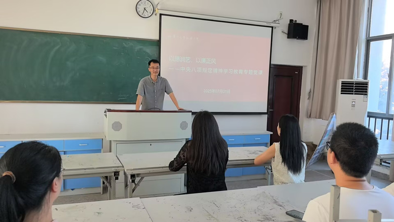 7 月 1 日,常州大学怀德学院艺术系在B214 教室开展 “以德润艺,以廉正风”—— 中央八项规定精神学习教育专题党课,系教工党支部书记商晓东主讲,全体教师党员参加。
