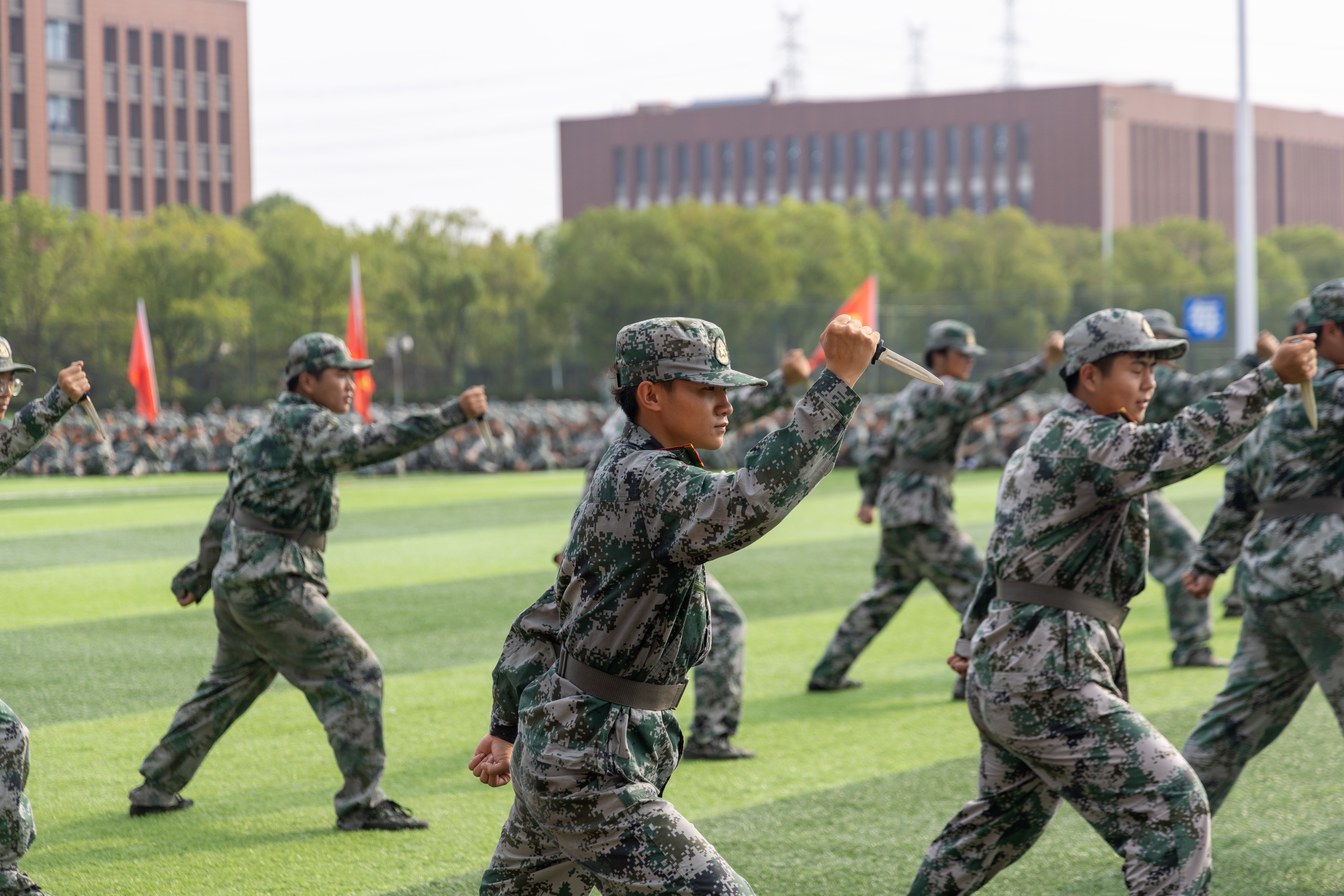 此次军训共计2800余名学生参训,分为九个连队和6个综合军事技能方阵。训练场上,同学们摆臂整齐划一,踢腿刚劲有力,从最初的步调凌乱到如今的“千人如一”,这变化的背后,是无数次重复的摆臂练习,是腿部负重的额外加练。同学们体会了军姿训练的艰辛,也从最初的陌生与不适,转变成如今的默契与坚韧。