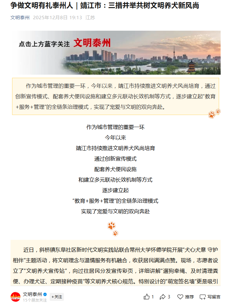 作为城市管理的重要一环,今年以来,靖江市持续推进文明养犬风尚培育,通过创新宣传模式、配套养犬便民设施和建立多元联动长效机制等方式,逐步建立起“教育+服务+管理”的全链条治理模式,实现了宠爱与文明的双向奔赴。