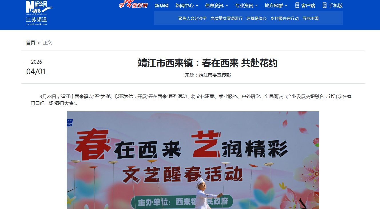 3月28日,靖江市西来镇以“春”为媒、以花为信,开展“春在西来”系列活动,将文化惠民、就业服务、户外研学、全民阅读与产业发展交织融合,让群众在家门口赶一场“春日大集”。