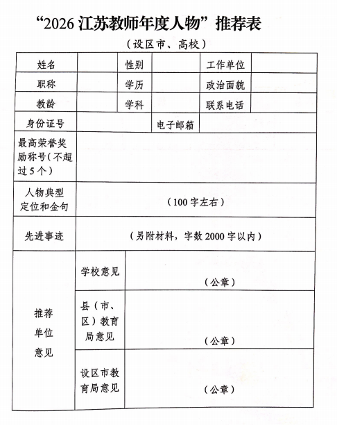 3.精心组织,积极申报。教师先进事迹材料要坚持实事求是,力求生动感人。请于4月10日下班前,将“2026江苏教师年度人物”推荐表(见附件)、候选人照片2~3张报人事处923办公室。